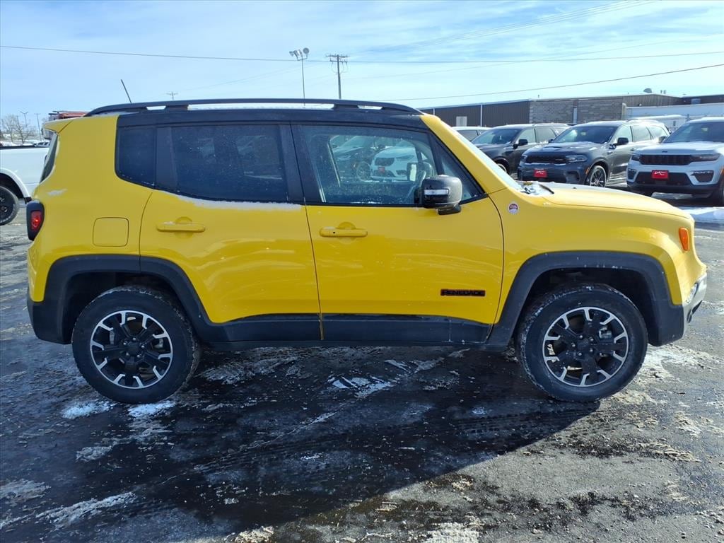 2023 Jeep Renegade Trailhawk 4WD Solar Yellow Clearcoat ** BACK-UP CAMERA, **NAVIGATION, **ACCIDENT FREE AUTO CHECK REPORT, **BLUETOOTH, Renegade Trailhawk 4WD, 4D Sport Utility, 1.3L I4, 9-Speed 948TE Automatic, 4WD, Solar Yellow Clearcoat, Black Cloth, 4-Wheel Disc Brakes, 6 Speakers, ABS brakes, Air Conditioning, Alloy wheels, AM/FM radio: SiriusXM, Anti-whiplash front head restraints, Apple CarPlay/Android Auto, Auto-dimming Rear-View mirror, Automatic temperature control, Brake assist, Compass, Delay-off headlights, Driver door bin, Driver vanity mirror, Dual front impact airbags, Dual front side impact airbags, Electronic Stability Control, Emergency communication system: SiriusXM Guardian, Four wheel independent suspension, Front anti-roll bar, Front Bucket Seats, Front Center Armrest, Front dual zone A/C, Front fog lights, Front reading lights, Fully automatic headlights, Heated door mirrors, Illuminated entry, Knee airbag, Leather Shift Knob, Leather steering wheel, Low tire pressure warning, Navigation System, Normal Duty Suspension, Occupant sensing airbag, Outside temperature display, Overhead airbag, Panic alarm, ParkView Rear Back-Up Camera, Passenger door bin, Passenger vanity mirror, Power door mirrors, Power steering, Power windows, Premium Cloth Low-Back Bucket Seats, Quick Order Package 22C, Radio data system, Radio: Uconnect 4C Nav w/8.4" Display, Rain sensing wipers, Rear anti-roll bar, Rear window defroster, Rear window wiper, Remote keyless entry, Roof rack: rails only, Security system, Speed control, Split folding rear seat, Spoiler, Steering wheel mounted audio controls, Tachometer, Telescoping steering wheel, Tilt steering wheel, Traction control, Trip computer, Turn signal indicator mirrors, Variably intermittent wipers, Voltmeter, Wheels: 17" x 7" Glossy Black Diamond Cut. 22/27 City/Highway MPG