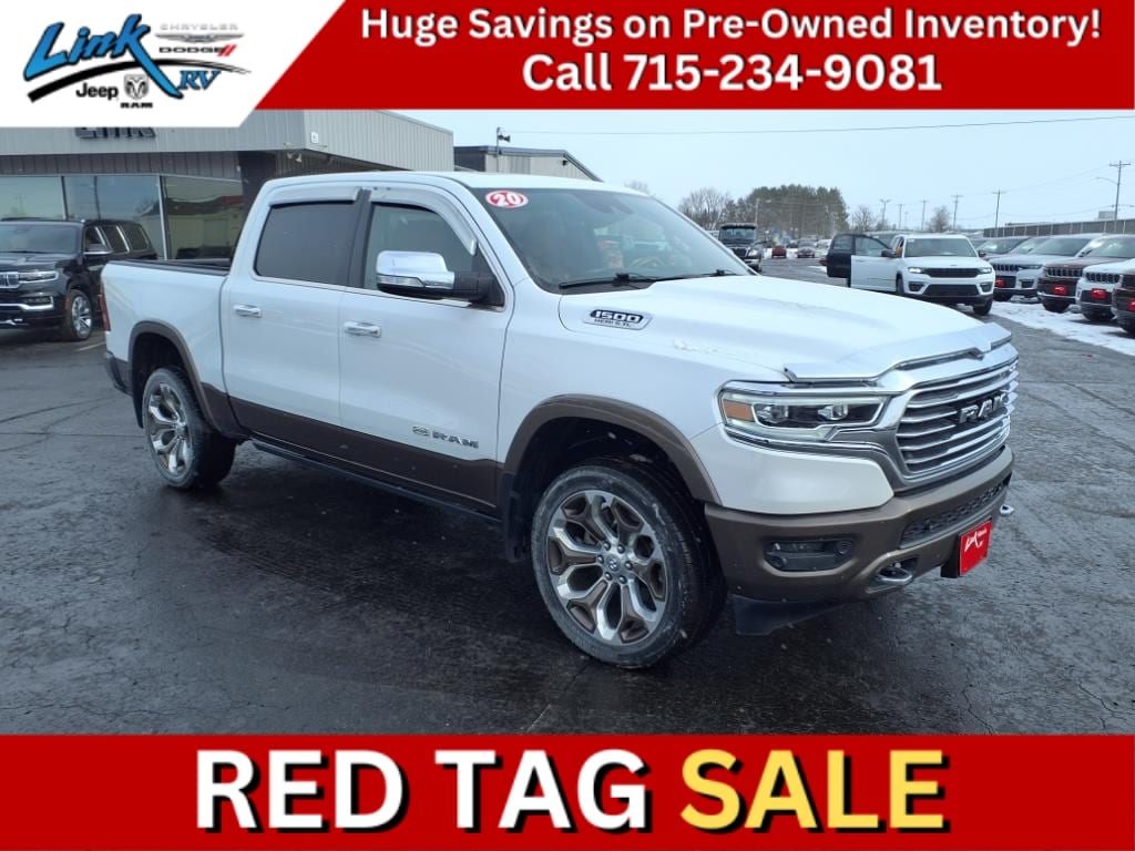 2020 Ram 1500 Laramie Longhorn Crew Cab 4WD Ivory White Tri-Coat Pearlcoat ** BACK-UP CAMERA, **NAVIGATION, **LEATHER INTERIOR, **PANORAMIC ROOF, **ACCIDENT FREE AUTO CHECK REPORT, **BLUETOOTH, **POWER RUNNING BOARDS**, 1500 Laramie Longhorn Crew Cab 4WD, 4D Crew Cab, HEMI 5.7L V8 Multi Displacement VVT, 8-Speed Automatic, 4WD, Ivory White Tri-Coat Pearlcoat, Black Leather, 10 Speakers, 3 Rear Seat Head Restraints, 3.21 Rear Axle Ratio, 4 Way Front Headrests, 4-Corner Air Suspension, 4-Wheel Disc Brakes, ABS brakes, Adaptive Cruise Control w/Stop & Go, Adjustable pedals, Advanced Safety Group, Air Conditioning, Alloy wheels, AM/FM radio: SiriusXM, Anti-Spin Differential Rear Axle, Apple CarPlay/Android Auto, Audio memory, Auto High-beam Headlights, Auto-dimming door mirrors, Auto-dimming Rear-View mirror, Automatic temperature control, Blind Spot & Cross Path Detection, Brake assist, Bucket Seats, Bumpers: chrome, Compass, Delay-off headlights, Dome Dual LED Reading Lamp, Driver door bin, Driver Seat Memory, Driver vanity mirror, Dual front impact airbags, Dual front side impact airbags, Dual-Pane Panoramic Sunroof, Electronic Stability Control, Emergency communication system: SiriusXM Guardian, Foam Bottle Insert (Door Trim Panel), Front anti-roll bar, Front Bucket Seats, Front Center Armrest w/Storage, Front dual zone A/C, Front fog lights, Front reading lights, Front Seat Back Map Pockets, Front wheel independent suspension, Full Speed Forward Collision Warning Plus, Fully automatic headlights, Garage door transmitter, Genuine wood console insert, Genuine wood dashboard insert, Genuine wood door panel insert, harman/kardon 19 Speaker Premium Sound, HD Radio, Heated door mirrors, Heated Front Seats, Heated front seats, Heated rear seats, Heated Second Row Seats, Heated Steering Wheel, Heated steering wheel, Illuminated entry, Integrated Center Stack Radio, Lane Keep Assist, Leather steering wheel, LED Dome/Reading Lamp, Longhorn Level 1 Equipment Group, Low tire pressure warning, Memory seat, No Satellite Coverage w/HI/AK/PR/VI/GU, Occupant sensing airbag, Outside temperature display, Overhead airbag, Overhead console, Panic alarm, Parallel & Perp Park Assist w/Stop, ParkView Rear Back-Up Camera, Passenger door bin, Passenger vanity mirror, Pedal memory, Power 4-Way Driver Lumbar Adjust, Power 4-Way Passenger Lumbar Adjust, Power 8-Way Driver & Passenger Seats, Power door mirrors, Power driver seat, Power passenger seat, Power Running Boards, Power steering, Power windows, Premium Leather Seats w/Filigree, Quick Order Package 27K Longhorn, Radio data system, Radio: Uconnect 4C Nav w/8.4" Display, Rain sensing wipers, Rear 60/40 Folding Split Recline Seat, Rear anti-roll bar, Rear seat center armrest, Rear step bumper, Rear window defroster, Remote keyless entry, Security system, Speed control, Split folding rear seat, Steering wheel mounted audio controls, Tachometer, Telescoping steering wheel, Tilt steering wheel, Traction control, Trailer Brake Control, Trip computer, Turn signal indicator mirrors, Variably intermittent wipers, Ventilated Front Seats, Ventilated front seats, Ventilated Rear Seats, Voltmeter, Wireless Charging Pad. Odometer is 22625 miles below market average!